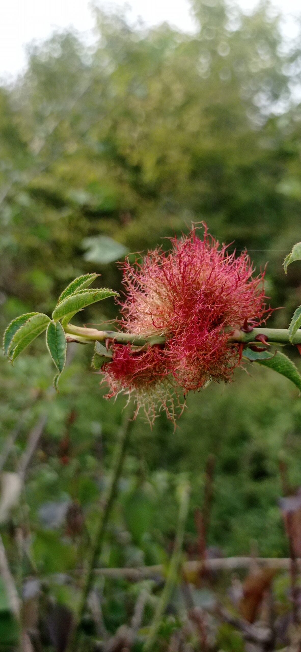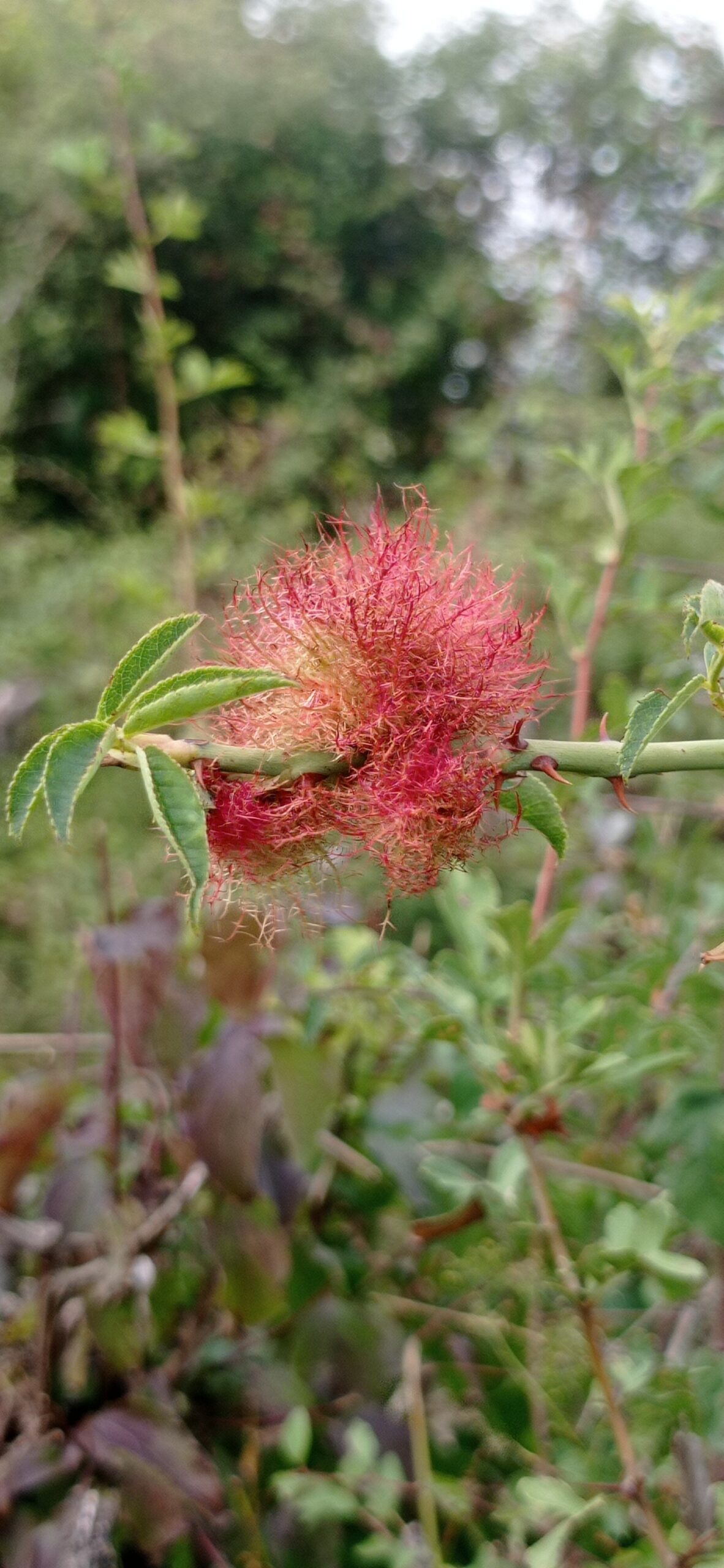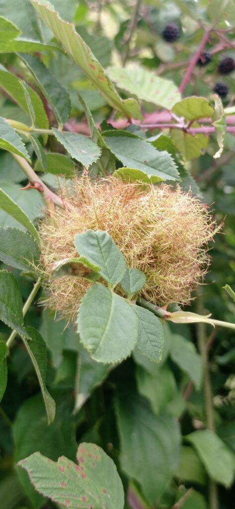 Au printemps la petite guêpe coutumière du fait, pond donc dans un bourgeon d’églantier, celui-ci pour se défendre crée une galle filamenteuse ressemblant à …une mousse chevelue genre éponge