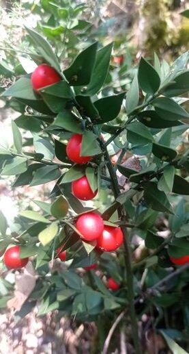 Le Fragon épineux, ou plutôt « la », car c »est la femelle qui porte les fruits, la plante mâle est un peu plus terne Ce qu’on pense être des feuilles ce sont …